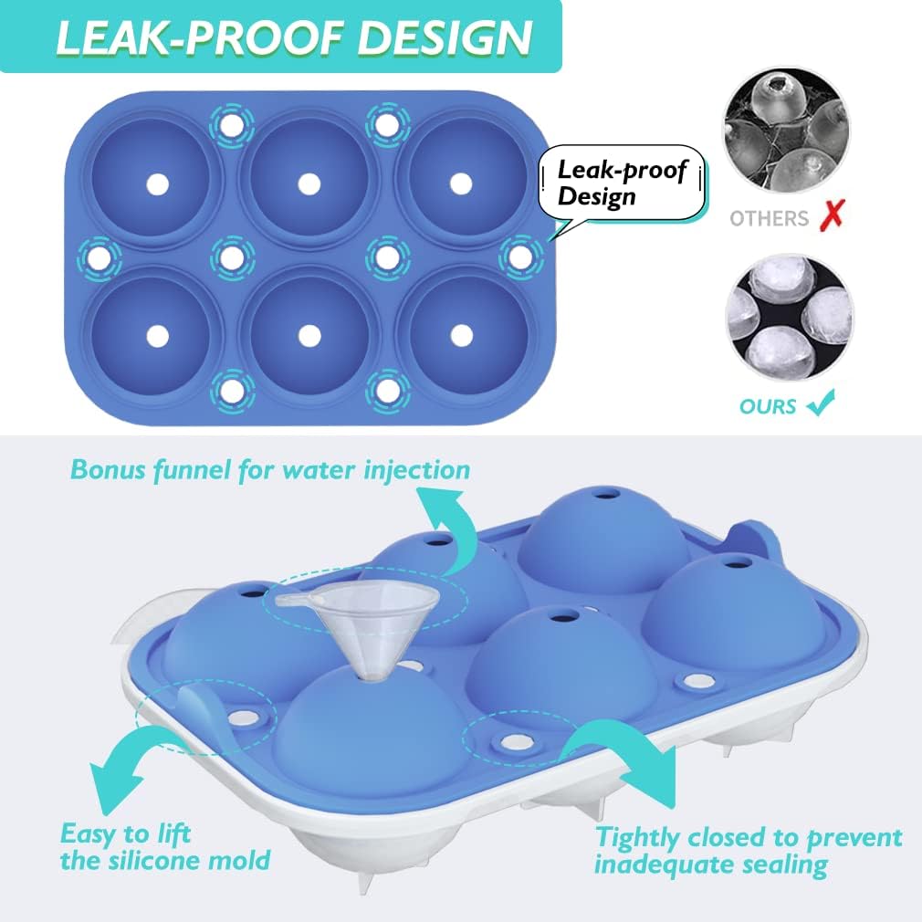 - [EASY TO FILL & LEAK-PROOF]: Please fill ball ice cube tray with the bonus funnel, press all the buckles tightly to get full ice balls. Ice sphere comes out of the form pretty well and rarely cracks. Round ice cube maker is an awesome alternative to traditional plastic ice ball trays.
