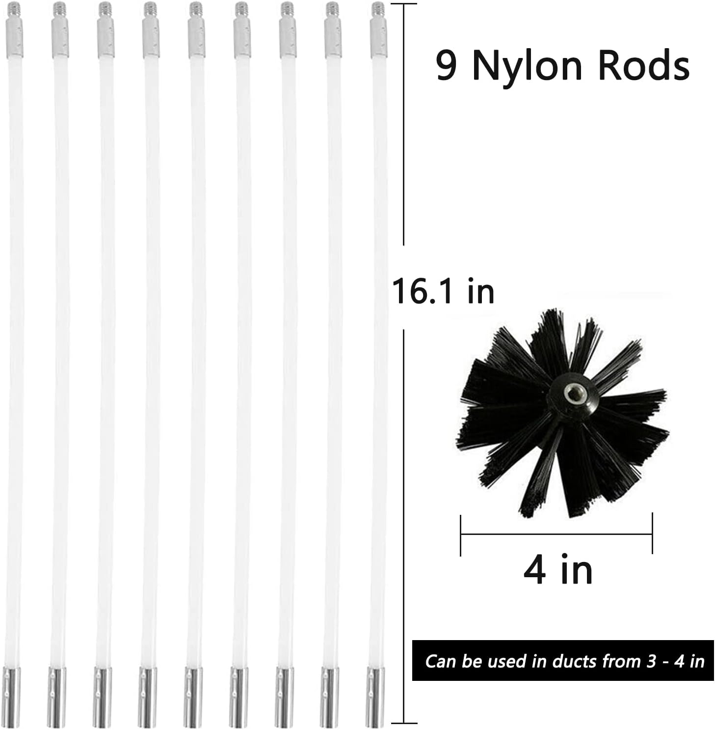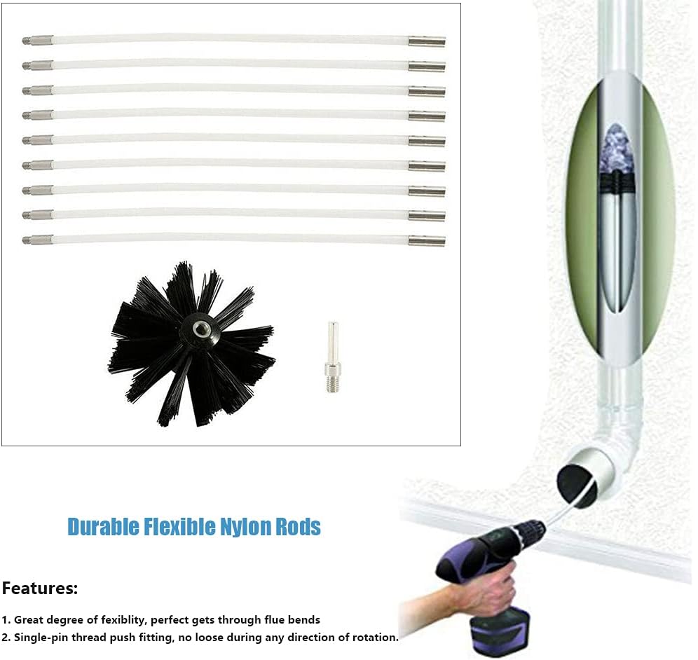 - 9 RODS + 1 BRUSH HEAD: Nylon rods can be bent and extended by 9 rods (410mm*100mm), Rod length: 41cm / 16 inch, , brush diameter: 10cm / 4 inch, can be used in ducts from 3 - 4 inch, small pipes, and small gaps can be easily cleaned, total length is 12 feet, extra long to clean the deeper areas of the fireplace.