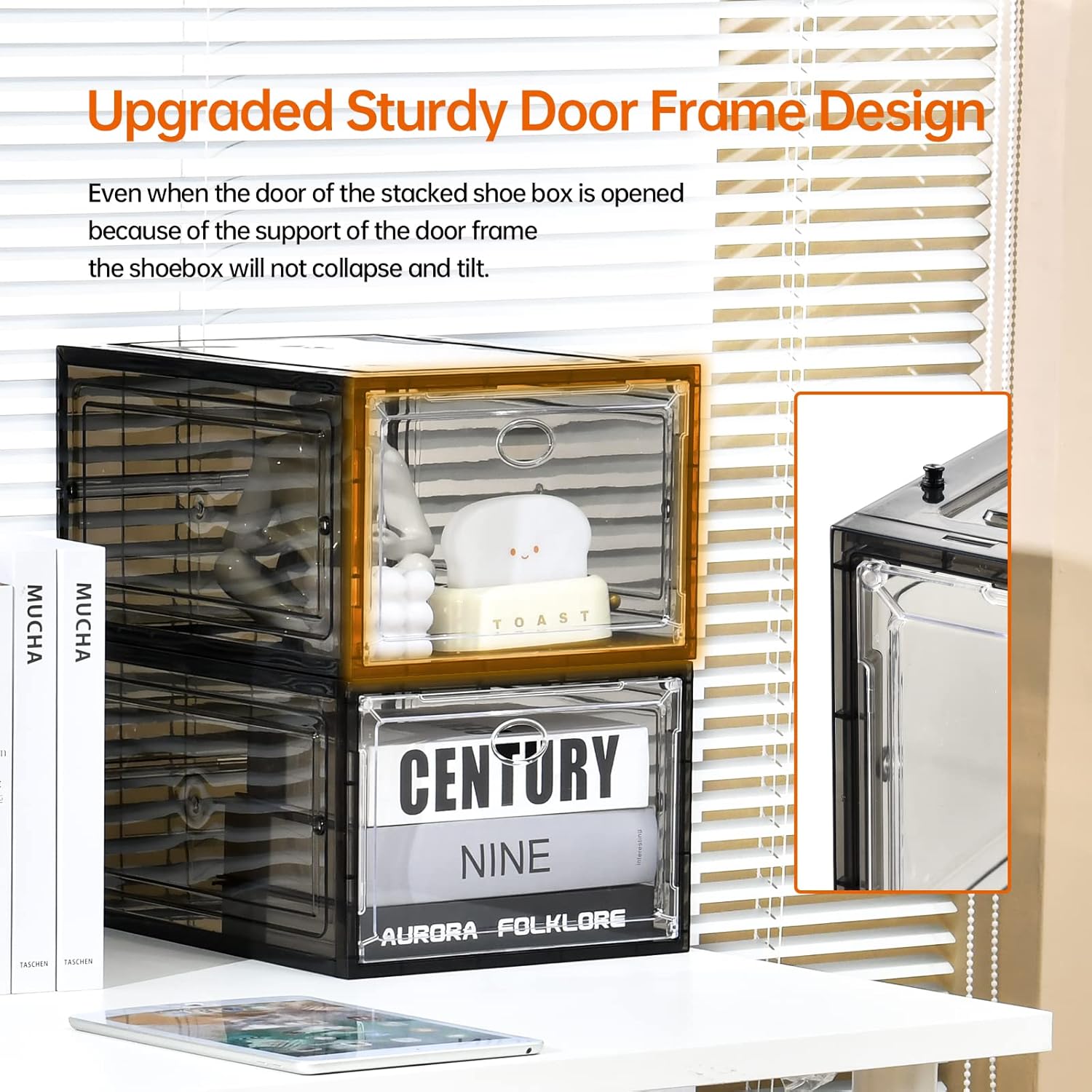 - [Easy to Assemble & Sturdy Hard Structure] Amllas shoe boxes are made of sturdy plastic material.Equipped with strong and sturdy door frame construction,which can keep the shoeboxes strong and not to collapse even when stacked.The corners of the shoebox are smooth,you can complete the assembly process in a few simple steps.