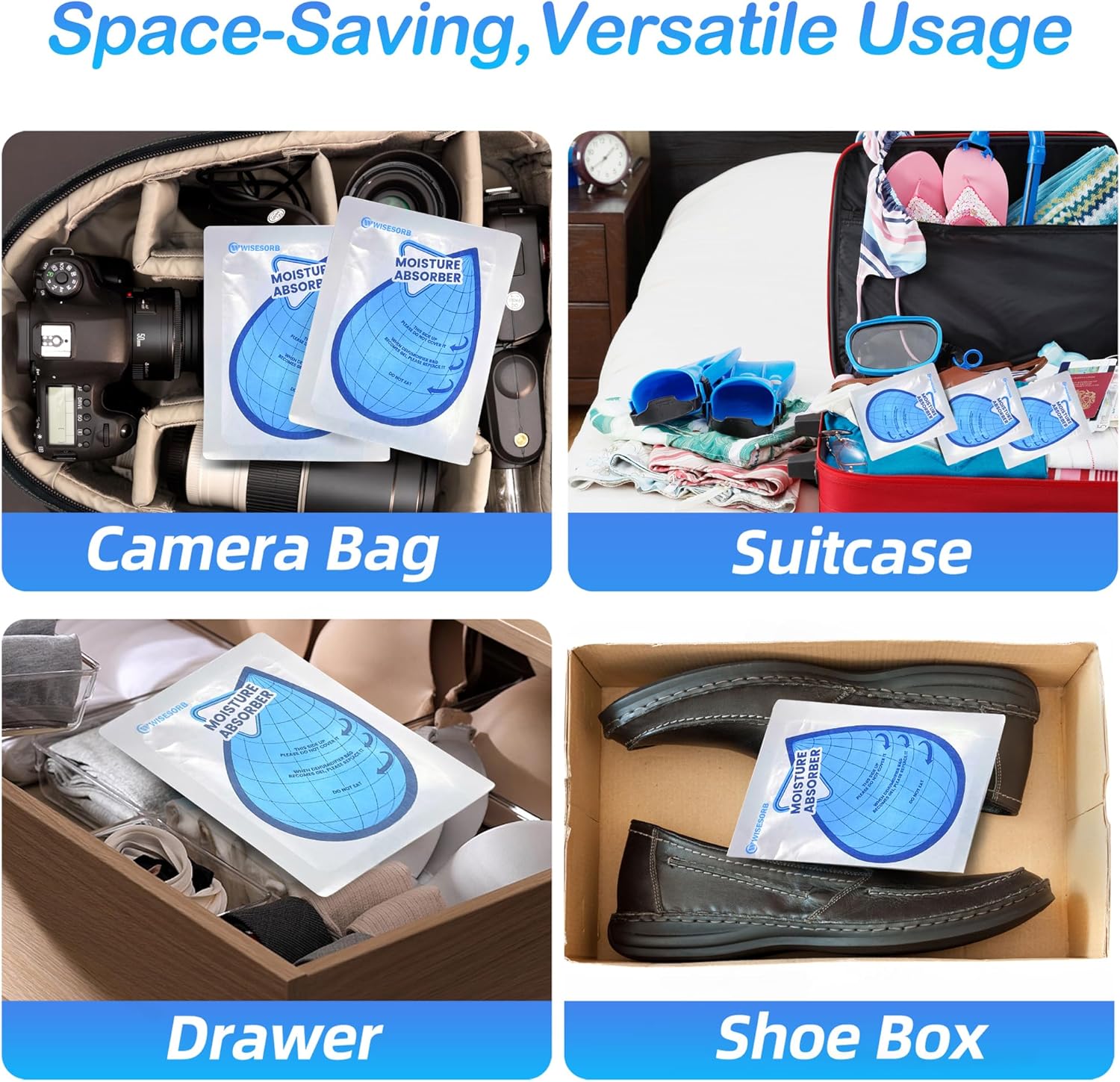 - 【Space-Saving】: Wisesorb moisture absorber bags are designed to save space, making them incredibly easy to use. Simply place them in the desired area without occupying much space. Placing them paper side up as instructed to observe the beads turning into gel, offering a visual confirmation of moisture absorption. The result is preserved crispness in clothes and the elimination of musty odors, making Wisesorb bags a reliable choice.