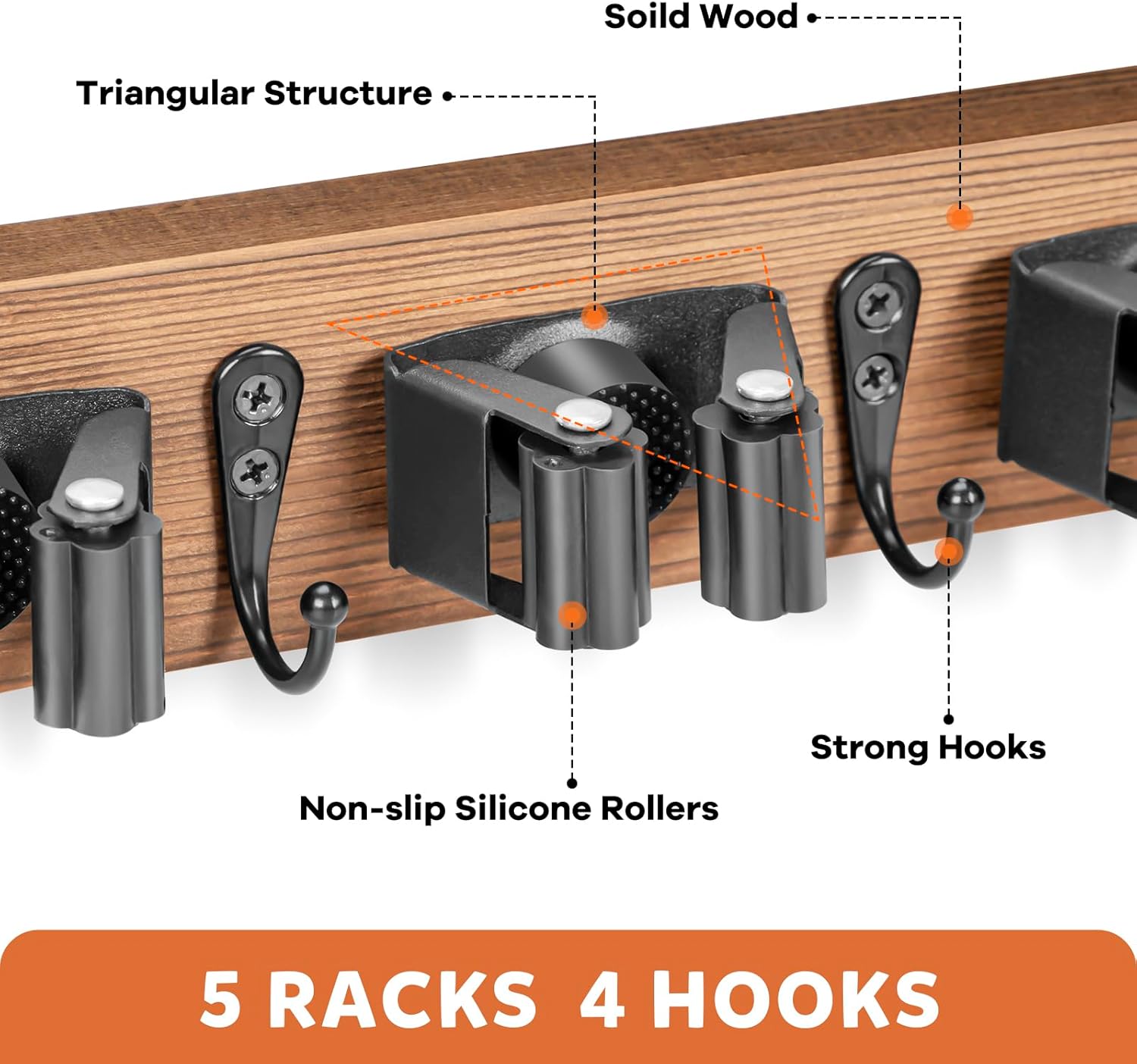 IMILLET Broom Holder Wall Mount, Rustic Wood Broom Hanger with 5 Racks and 4 Hooks, Laundry Room Organization and Storage, Mop Holder for Home Decor, Garden, Garage, Kitchen, Closet