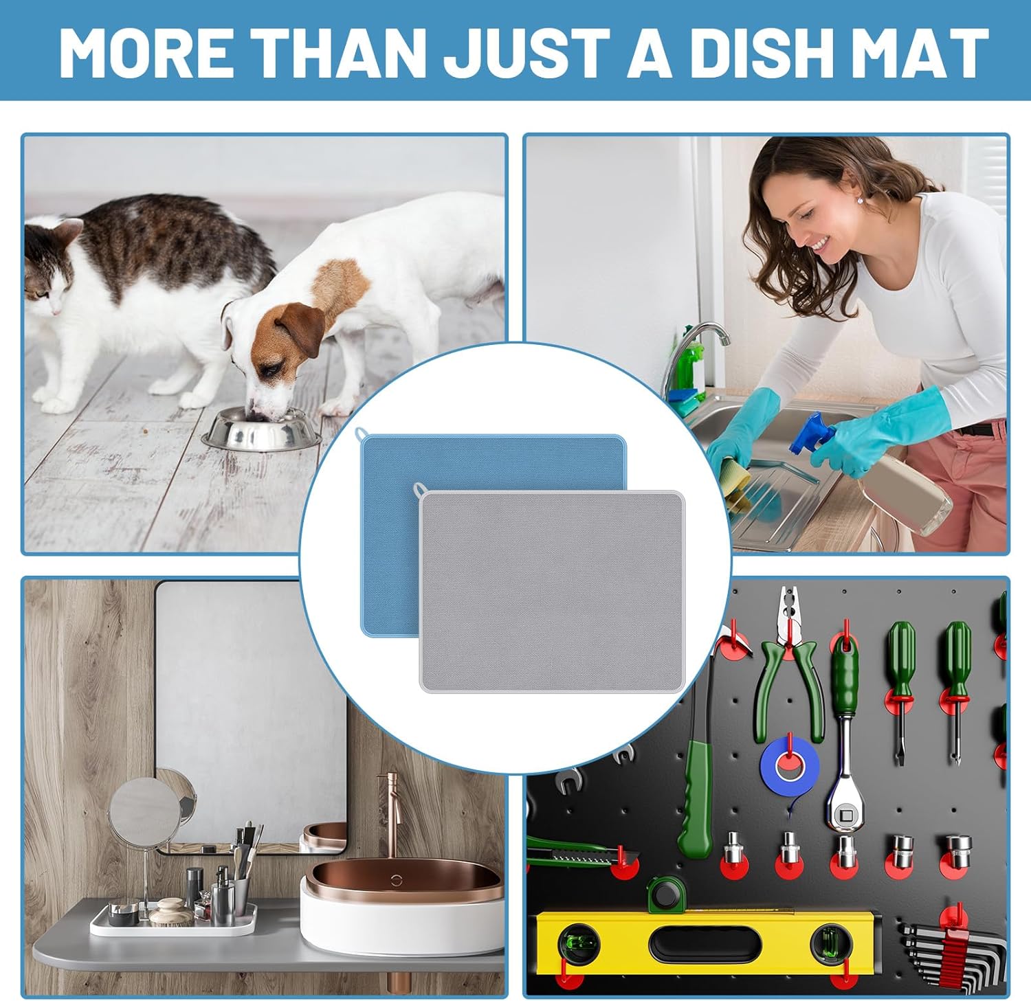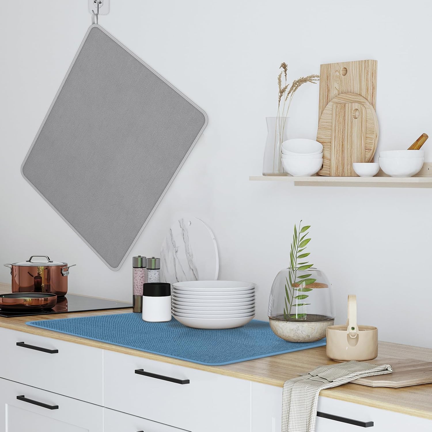 - Reliable Material and Attractive Design: get the ideal balance of functionality and style with our kitchen drying mats for dishes; Made from microfiber, these mats exhibit impressive water absorbent property, ensuring a dry, clean countertop; Their pleasing gray and blue color will effortlessly blend with most kitchen interior, enhancing its aesthetics