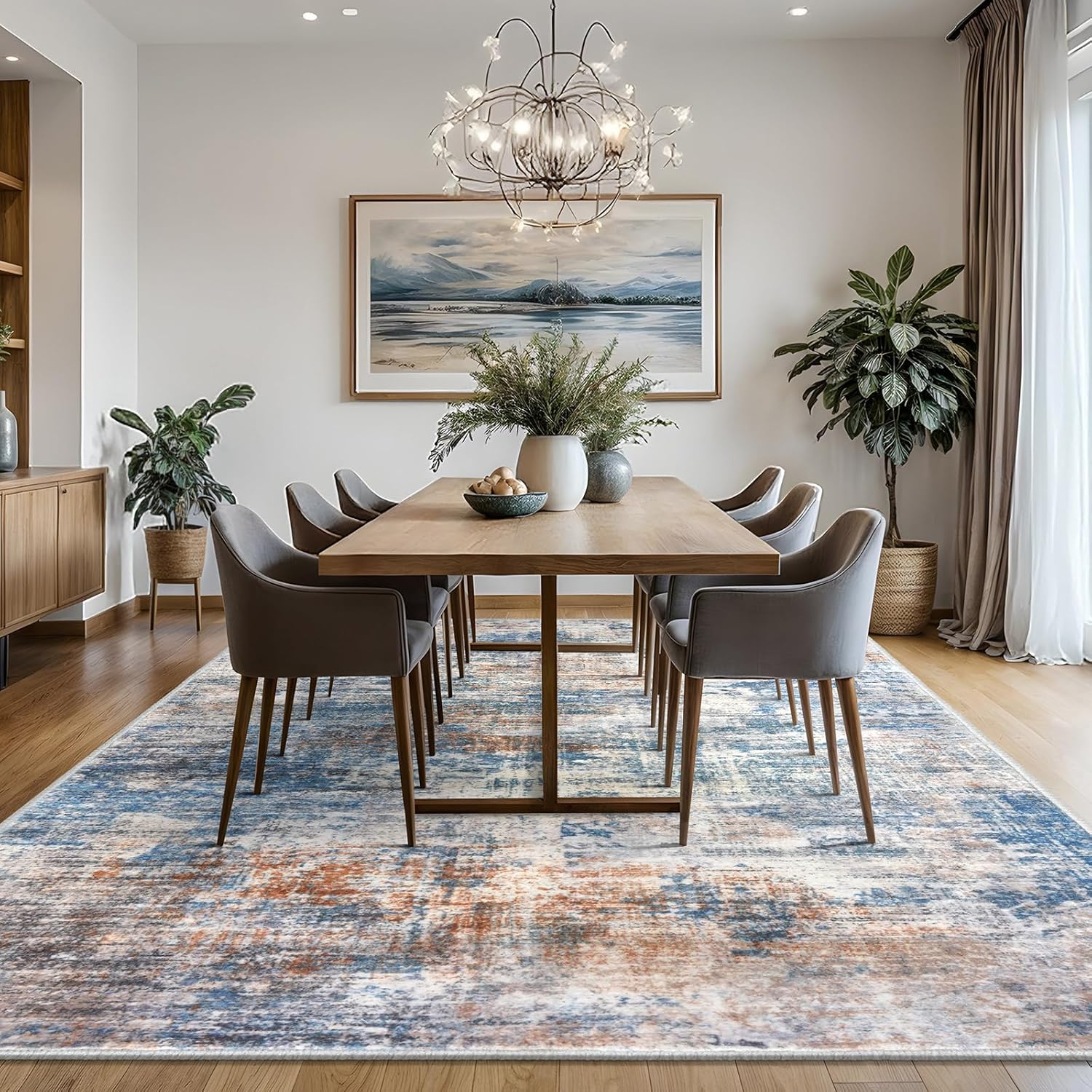 - Machine Washable: This dining room rug is machine washable for easy maintenance, keeping it fresh and vibrant without the need for manual cleaning. Noted: When vacuuming, use a low setting or a robotic vacuum to prevent shifting or bunching