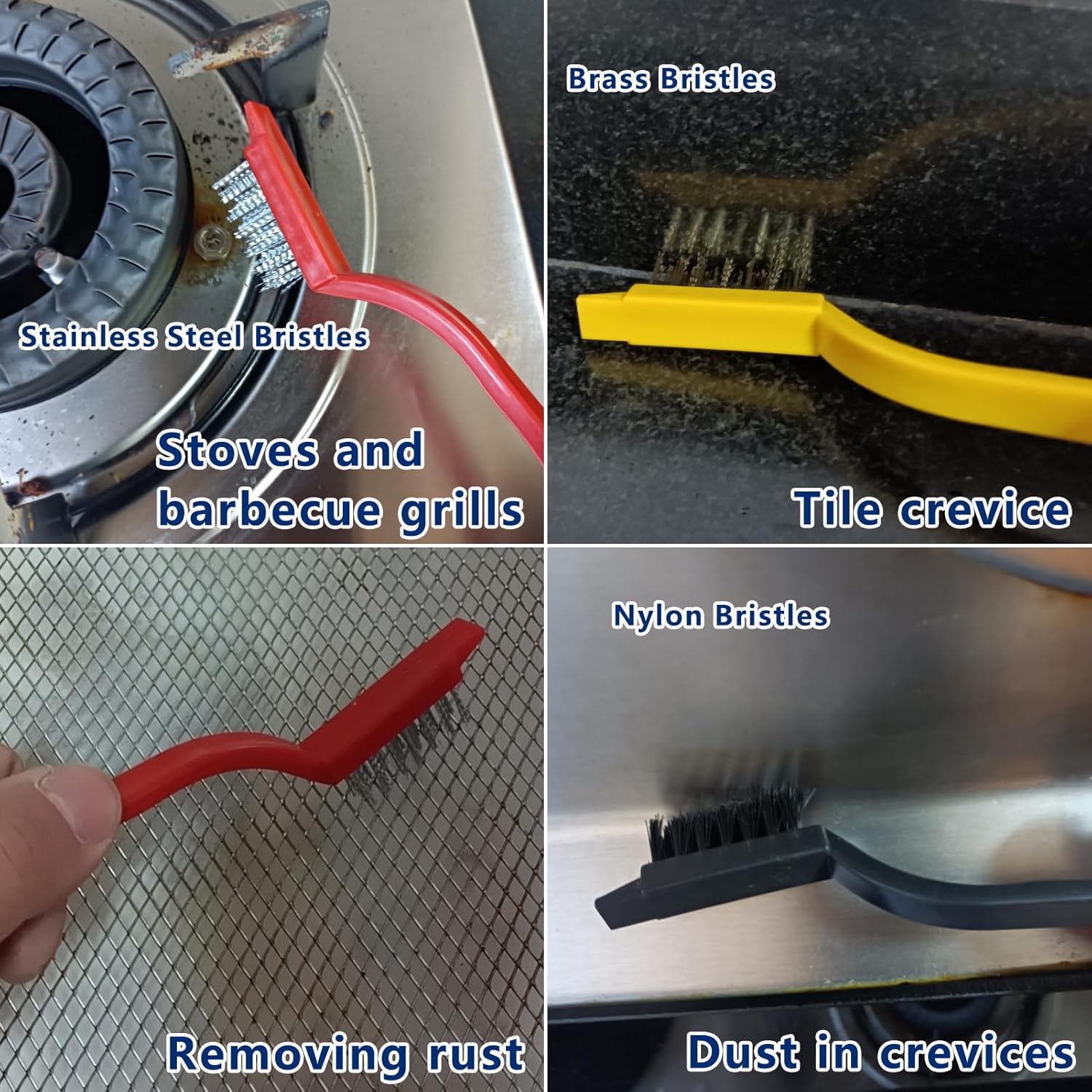- Three colored brushes provide different cleaning strengths (brass>stainless steel>nylon), and stainless steel brushes are your preferred choice for removing dirt and corrosion. A brass brush can effectively remove stubborn stains, gas stoves, and pot bottoms. Nylon brushes are an ideal choice for detailed surfaces. Very suitable for cleaning stains in small crevices. The brush head adopts a scraper design, which can effectively remove stubborn stains.