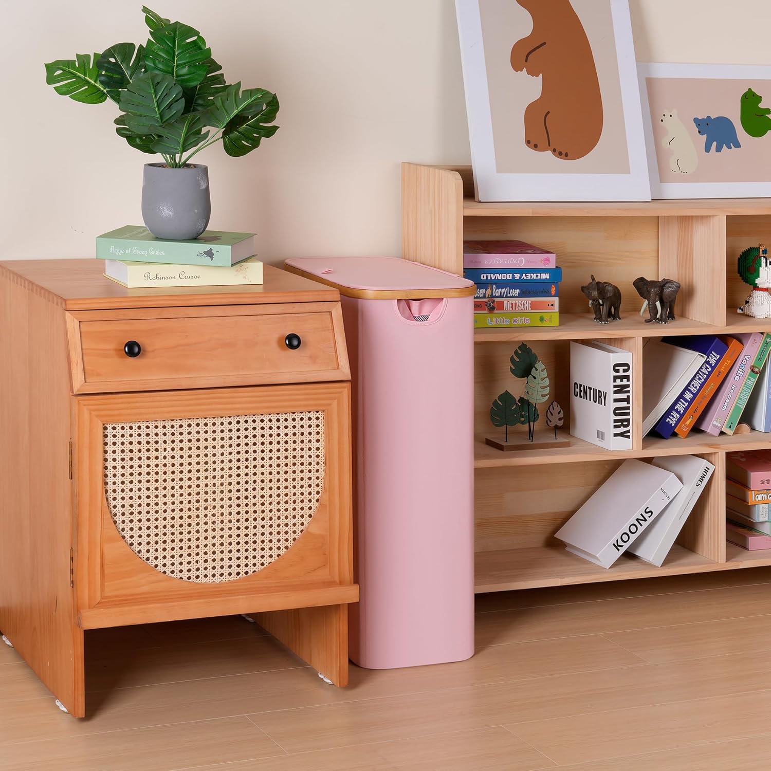 100L Laundry Hamper with Lid, Lagre Basket with Bamboo Handles,Foldable Clothes Hamper Tall Dirty Laundry Basket for Clothes Toys Towels Organizing,Pink