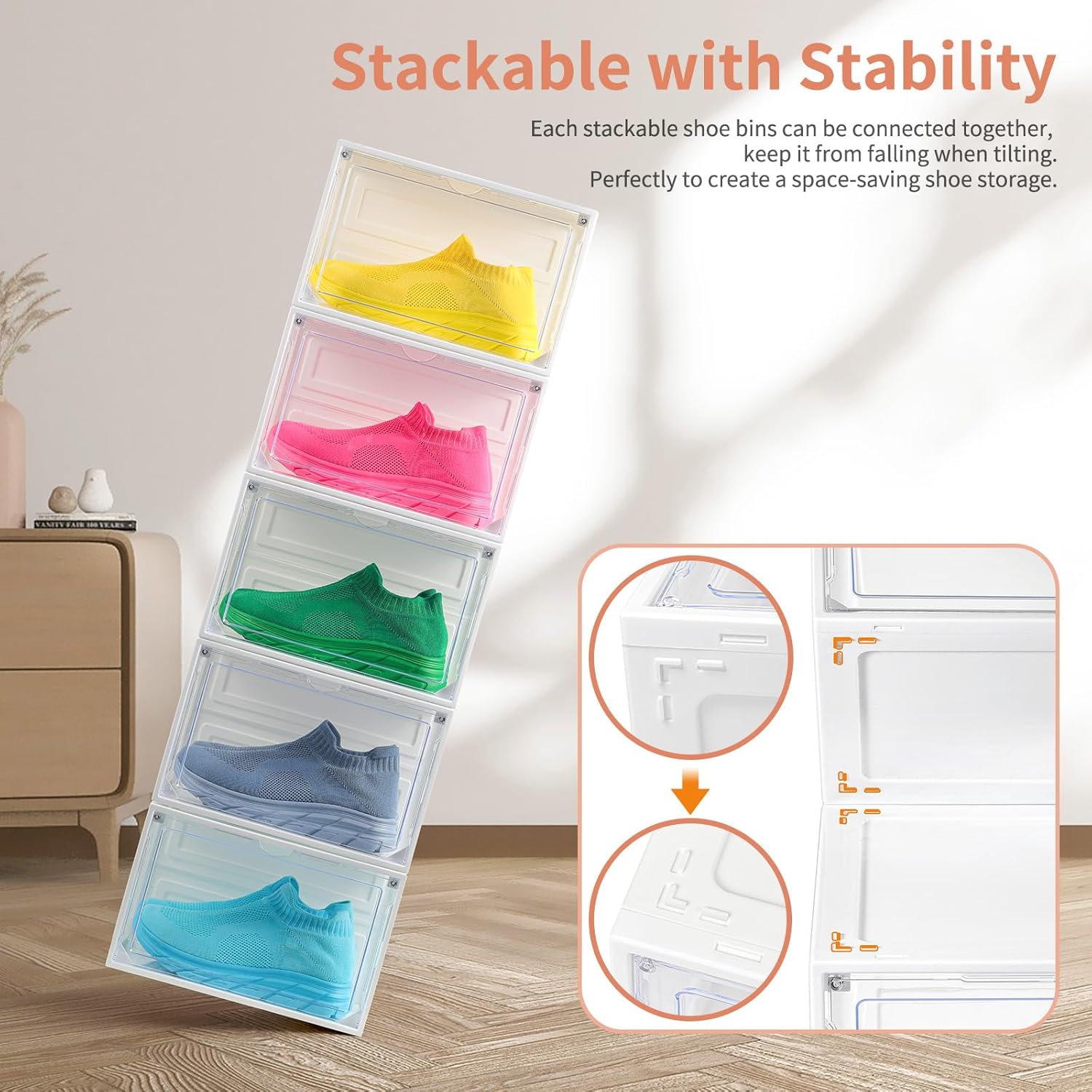 - 【Magnetic Door& Ventilate Design】The shoe storage boxes have built-in magnetic function.The door can be easily opened and closed by the upgraded magnetic suction.In addition,we set vents in the door.Our stackable shoe box has excellent breathability to prevent the accumulation of odor.