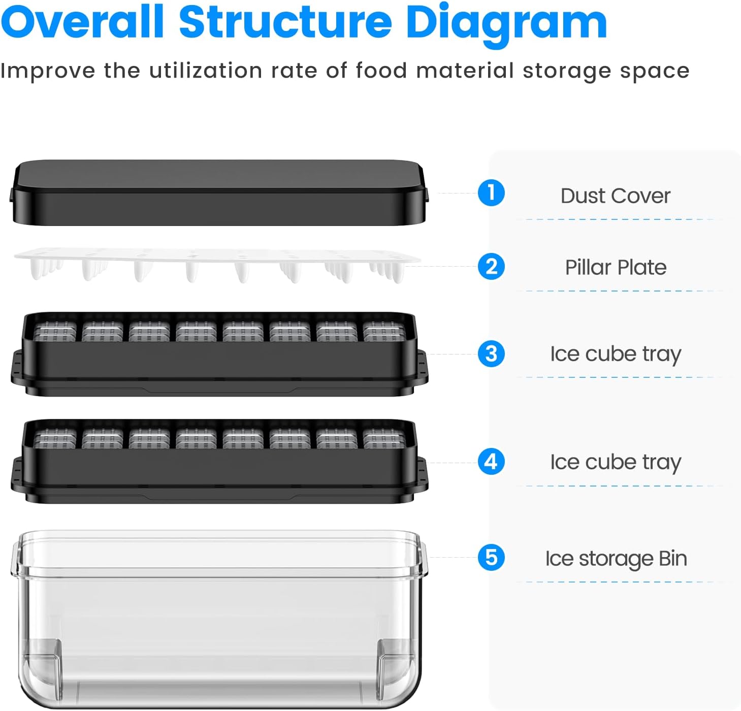 - Food Grade Material & BPA Free:This ice trays for freezer with lid and bin are made of food grade PP material, which is safe and can be frozen and used repeatedly for a long time.The ice cube tray is NOT DISHWASHER SAFE