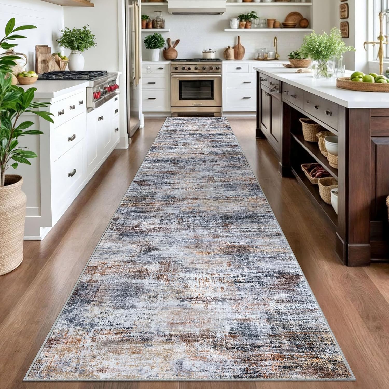 IOHOUZE Abstract Runner Rug 3x16 Ft Washable Runners for Hallways, Non Slip Kitchen Runner Printed Faux Wool Entryway Runner Indoor, Modern Abstract Floor Carpet for Hall Stair, Orange Grey