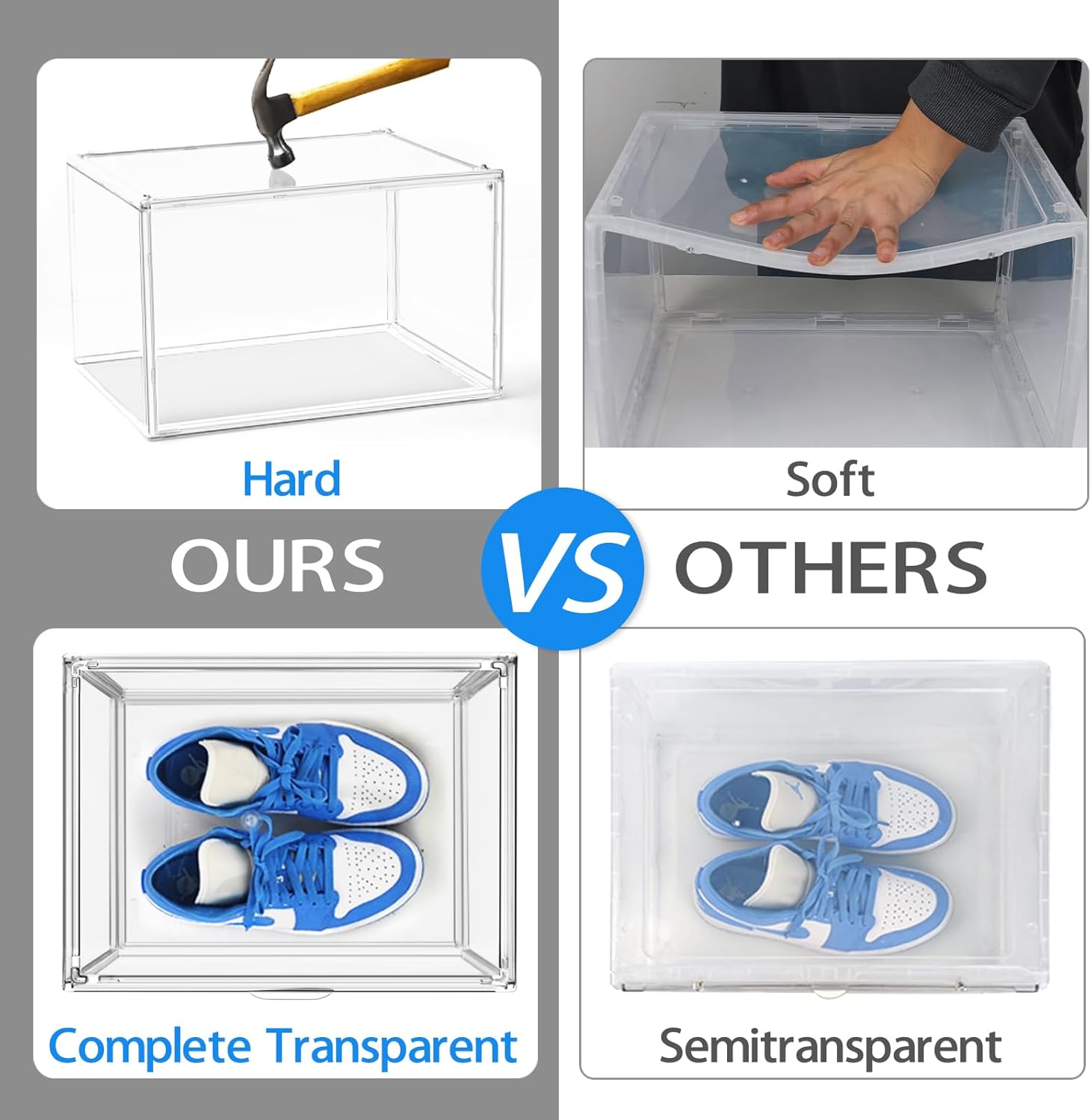 - Stackable and Sturdy:The shoe box is made of high-quality environmentally friendly plastic with good toughness and strength.It can withstand a certain pressure, not easy to crack, to ensure that in the stacking process, the lower shoe box will not be damaged by the upper pressure