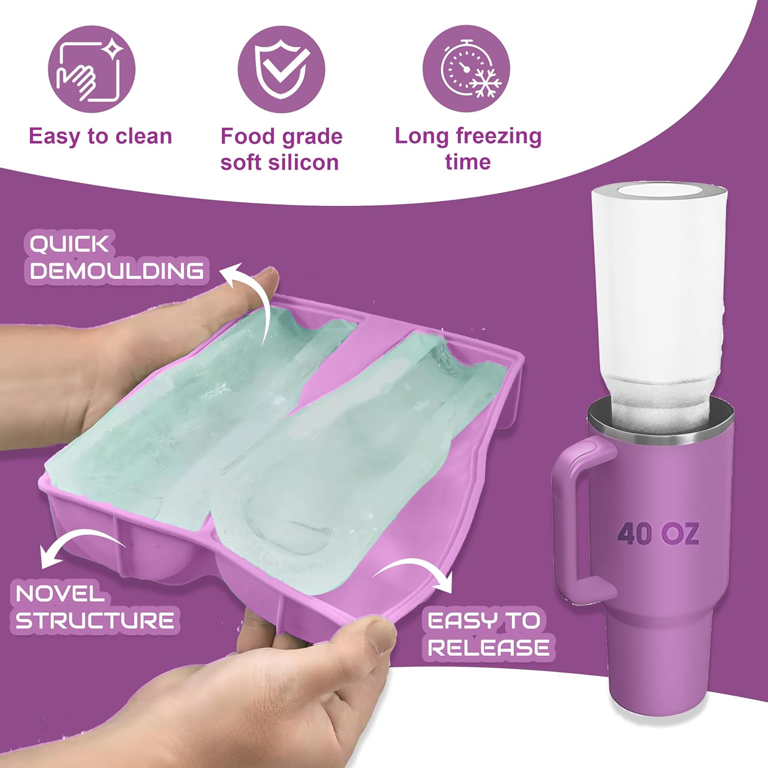 - DIMENSIONS: Creates ice cylinders perfectly sized for 40 oz tumblers, with a purple silicone mold that's freezer-safe and easy to clean