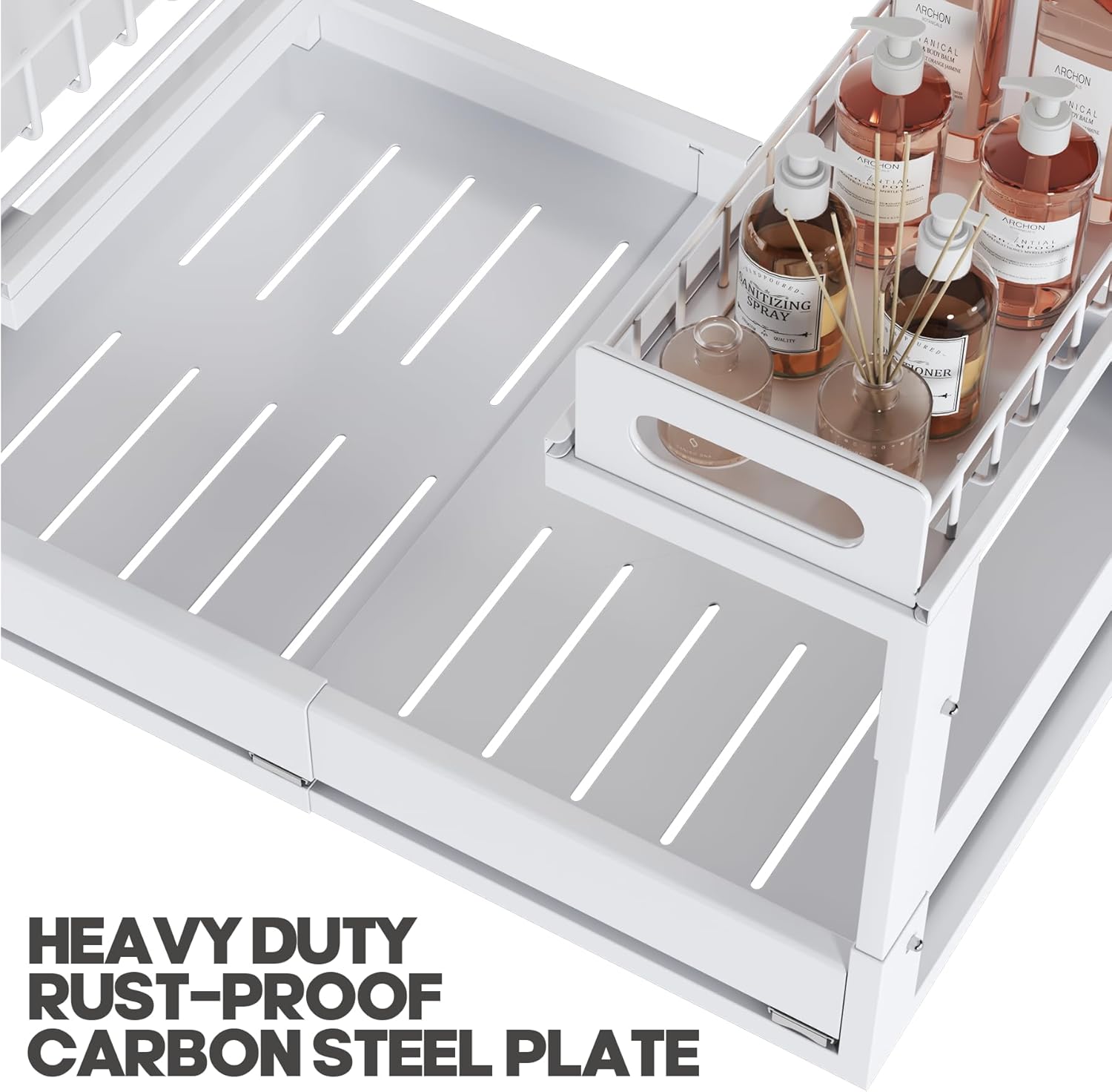 - 【Premium Metal Frame&Multi-function】Made from sturdy metal, this organizer is built to last and holds heavy bottles, cleaning supplies, and kitchen essentials without bending. Powder-coated rust-resistant finish ensures long-term durability. Perfect for kitchens, bathrooms, and laundry rooms, this under sink storage solution makes the most of every inch. Whether for cleaning products, toiletries, or cookware, it keeps everything neatly stored and within reach.