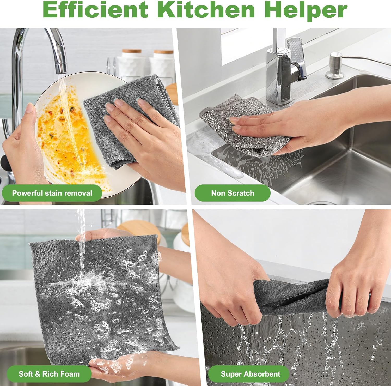 - Reusable & Long-Lasting---The microfiber cleaning cloth side is suitable for washing dishes and wiping tables.Microfiber cleaning cloths are made of polyester and polyamide. These cleaning towels are soft to the touch, lint-free and super absorbent. Its versatility makes it an indispensable tool in the kitchen, easing the burden of various cleaning tasks!