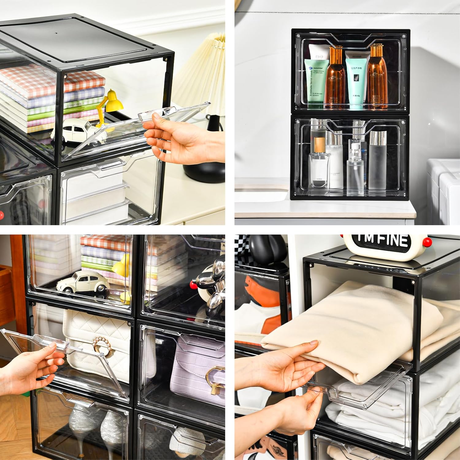 - Multipurpose Storage: These clear shoe boxes stackable is designed for making it easier to find anything in need. Suitable for storage with shoes, clothes, socks, hat, underwear, bra, scarves,accessories. Finally, stack the boxes neatly to save a lot of space.