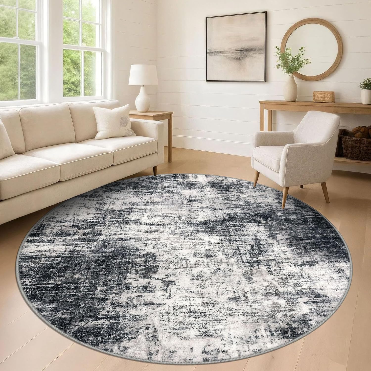 IOHOUZE Abstract Round Area Rug 8 Ft Washable Circle Rugs Large Round Rug Non Slip Thin Soft Circle Rugs, Printed Faux Wool Floor Carpet for Bedroom Living Room Dining Room Nursery, Black Grey