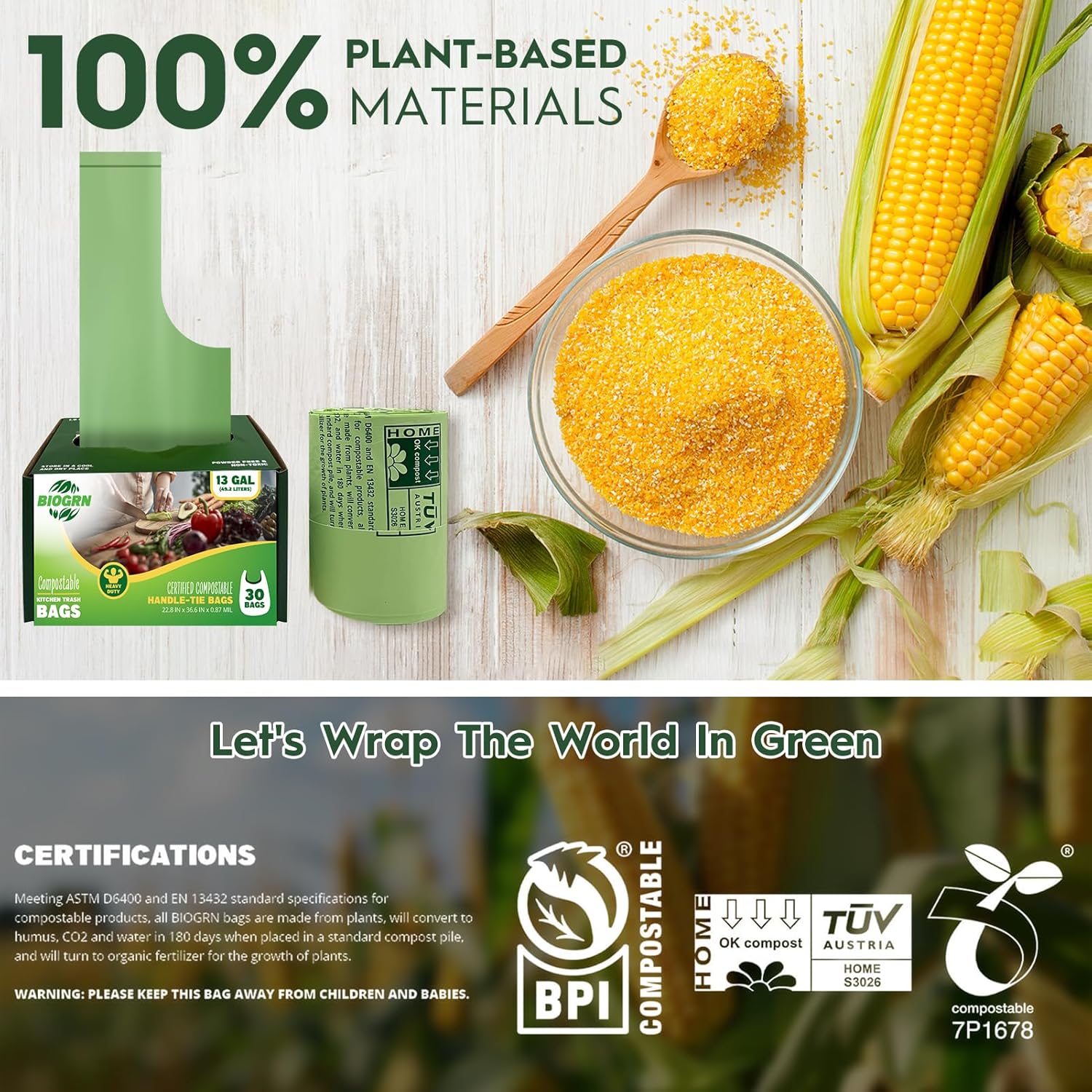 - Certified Compostable Material:Made from premium PLA+PBAT blend, these 13 gallon compostable trash bags meet strict BPI, OK COMPOST, and TUV certifications. They naturally decompose within 180 days, turning into nutrient-rich humus - a smarter choice for your compost bin and the planet.