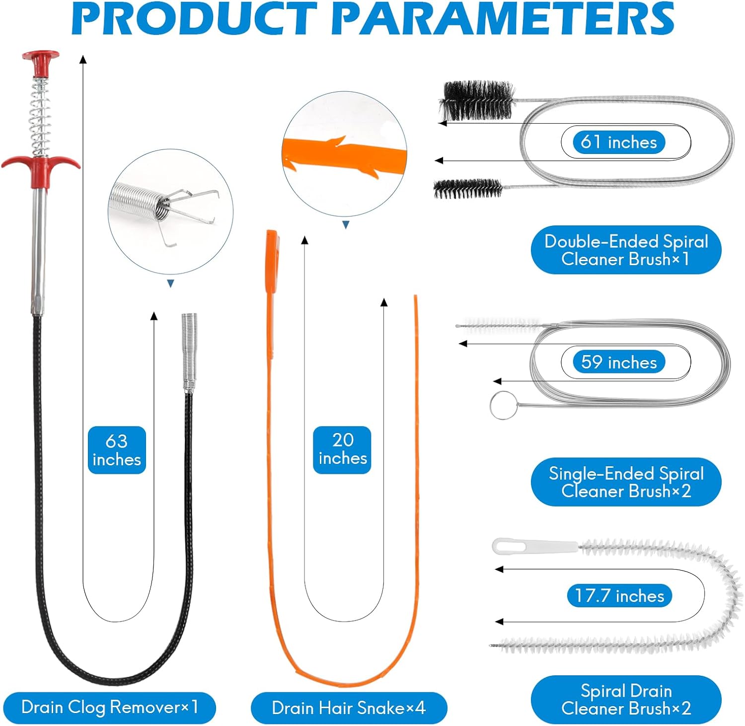 - 【WIDELY FUNCTIONAL】Bendable 20-inch drain snake with barb hooks extracts hair clogs deep in pipes, working as an effective hair drain clog remover; spiral and spring drain cleaning brushes work on fridge drains, car sunroof tubes & aquarium lines