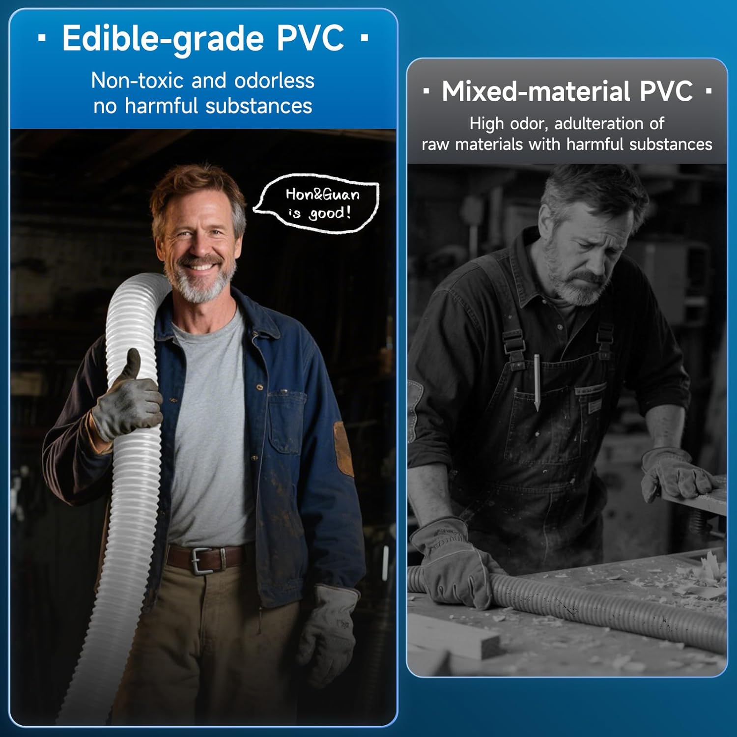 - Premium PVC: Hon&Guan dust collection hose uses edible-grade PVC, harmless, odorless. Strong puncture resistance withstands dust/debris. Transparent design allows checking internal debris for timely cleaning, preventing clogs and boosting safety