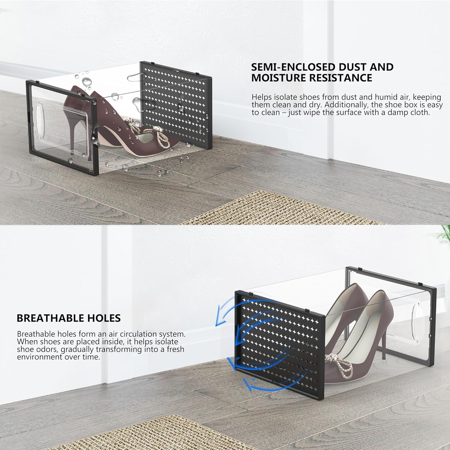 - Superior Shoe Organizer Solution: The lids of shoe boxes securely close to keep contents dust-free than traditional racks and provide better ventilation than closed shoe cabinets. Keeps your shoes fresh and dry while ensuring that they stay in great condition.