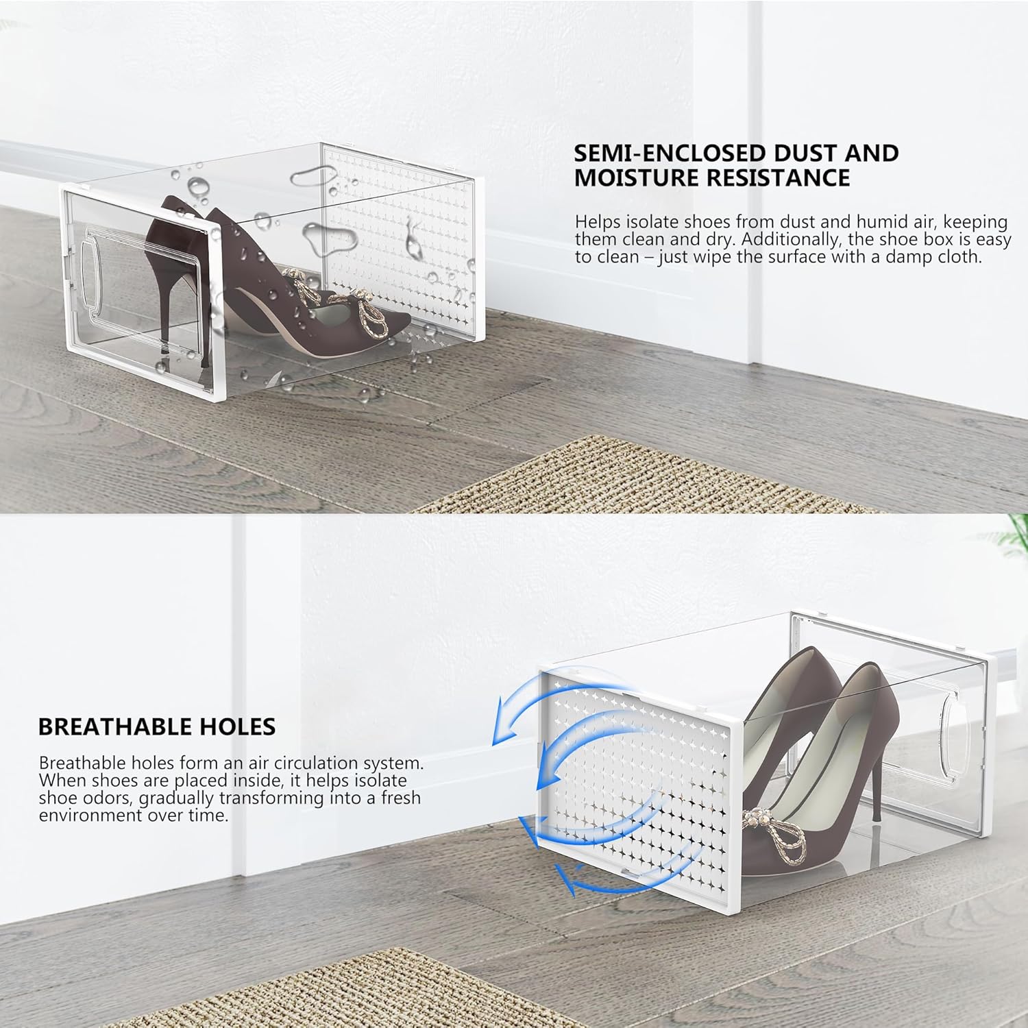 - Superior Shoe Organizer Solution: The lids of shoe boxes securely close to keep contents dust-free than traditional racks and provide better ventilation than closed shoe cabinets. Keeps your shoes fresh and dry while ensuring that they stay in great condition.