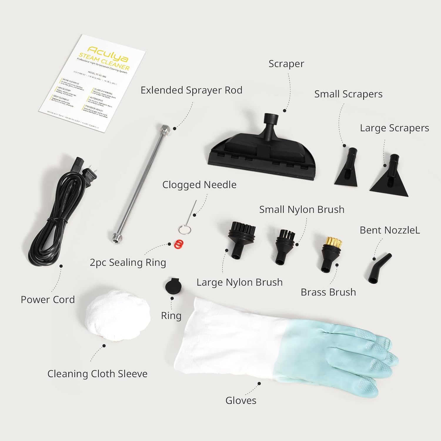 - You can get: 1 x grout steam cleaner with tank, 1 x 59" steam pipe, 1 x 78.7" power cord, 1 x window scraper+ rubber Strip, 1 x clogged needle, 1 x extended sprayer rod, 1 x brass brush , 2 x nylon brush,1x cleaning Cloth Sleeve, 1 x bent nozzleL, 2x scrapers, 2 x gloves, 2 x waterproof sealing ring and 1 x user manual.